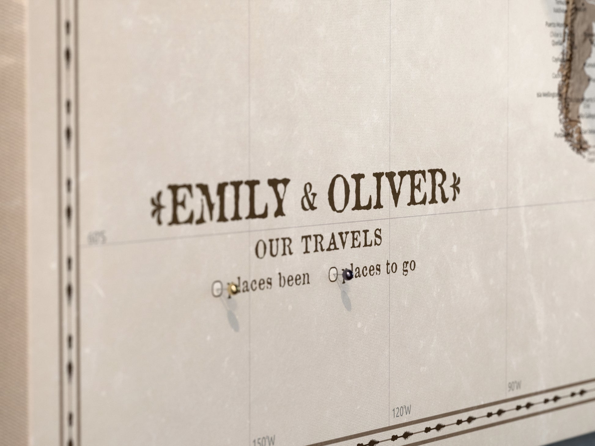 Fügen Sie Ihren eigenen Text hinzu, markieren Sie Ihre Reisen mit Pins - Ihre Karte erhält einen sentimentalen Wert und wird zu einem perfekten dekorativen Element.