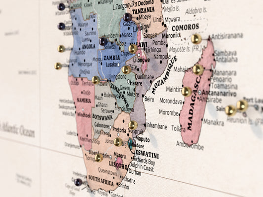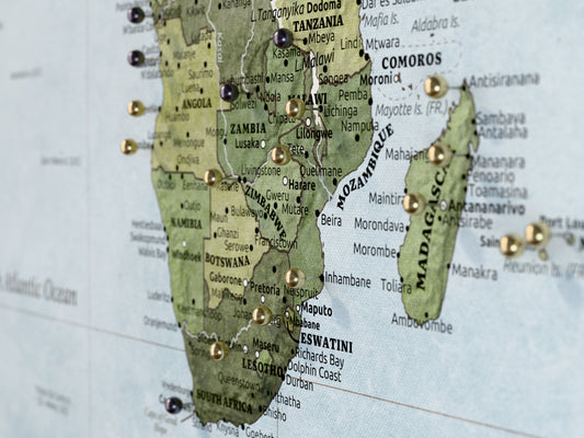 Halten Sie Ihre Reiseerinnerungen fest, indem Sie Notizen, Fotos und Andenken auf unserer stilvollen Pinnwandkarte anbringen. Perfekt, um vergangene Reisen zu visualisieren und neue Abenteuer zu planen. Erstellen Sie ein visuelles Tagebuch Ihrer Reisen, indem Sie die Orte markieren, die Sie besucht haben, und die Ziele, von denen Sie träumen.