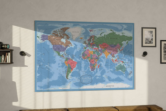 Personalisierte Weltkarte auf Leinwand mit Stecknadeln - Pastellstimmung